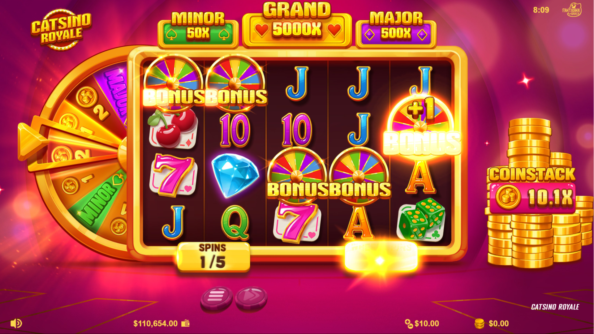 | Stack N Spin Bonus | Five base spins + Catsino Wheel spins; collect coins, grow Coinstack |