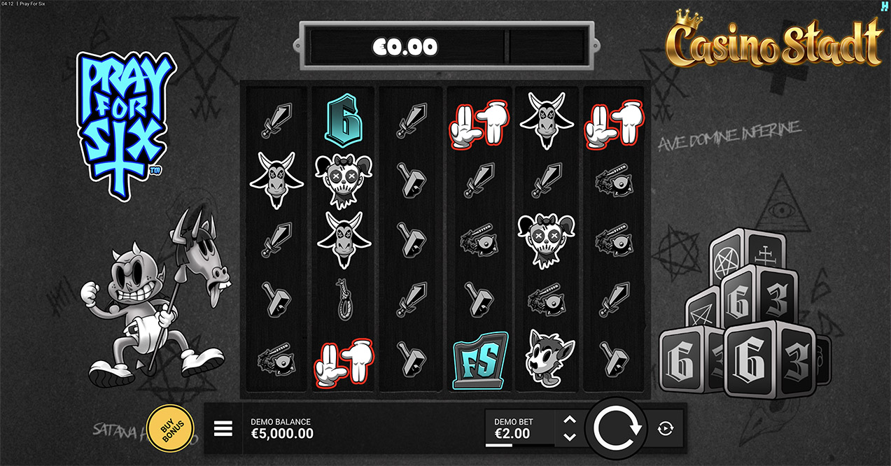 Set in a warped, grayscale underworld, Pray for Six features the Devil’s Spawn and Pyropup flanking the reels, grinning through the chaos. The vibe is spooky-meets-slapstick, with sudden bursts of color on feature triggers and prize reveals. Hacksaw leans harder into its retro animation aesthetic here, making the visuals feel both familiar and fresh.