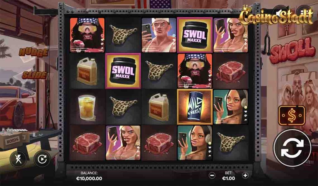Land three Protein Powder Scatters and you’ll enter the Free Spins round with 6 “Nudge Reps.” This means stacked Swolls on every spin and a shot at triggering Slide for added payout power.